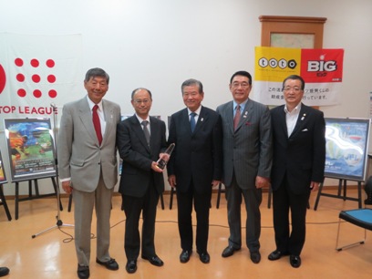 | 左から、多田JHL会長、梯 前GM、 川淵トップリーグ連携機構副会長、 市原トップリーグ連携機構専務理事 川上日本協会専務理事 |